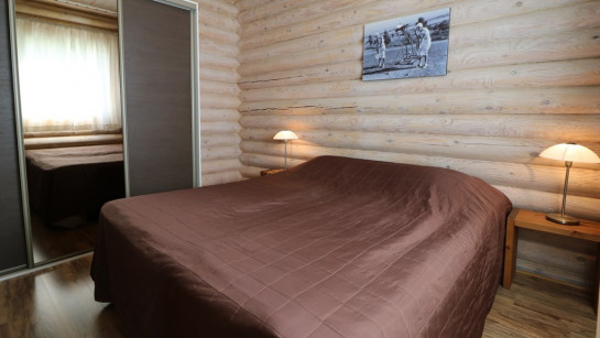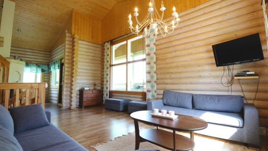 На другому поверсі котеджу розташовані дві спальні, в кожній з яких по двоспальному ліжку. На першому поверсі також дві спальні, в одній з яких диван-ліжко, на якому може розміститися два гості, а в другій – ліжко шириною 120 см. На першому поверсі котеджу, у вітальні, також є розкладний диван, який може розмістити двох гостей. Будинок призначений для цілорічного розміщення. У котеджі електричні радіатори з термостатами, підігрів підлог, камін і додаткова спліт-система. На рівні першого поверху простора крита тераса, яка огинає будівлю з двох сторін. Там ви можете готувати на газовому грилі м'ясо, рибу чи овочі. Велика берегова сауна топиться на дровах. З парилки є прямий вихід на терасу, і сходами можна швидко дістатися до причалу, а звідти пірнути у воду. У роздягальні берегової сауни є електричне опалення, холодильник і розкладний диван для двох. За бажанням частина вашої компанії може розміститися і тут. На узліссі лісу за сауною розташувався біотуалет. Місця тут дуже рибні: в озері водиться щука, сиг, лящ, судак. А навколишні ліси приємно здивують тих, хто воліє проводити час, збираючи гриби та ягоди – рядки, лисички, підсиновики, підберезники, білі гриби, а також брусницю та чорницю.