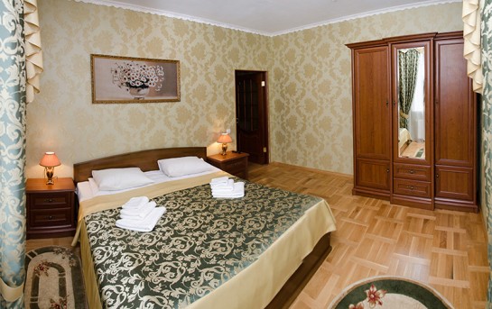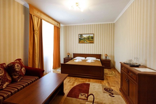 Номер із зручностями (суміщений санвузол, душ, туалетні аксесуари, фен, халати, одноразові тапочки). 2 кімнати (спальна, вітальня). У спальні: двоспальне широке ліжко, дві тумбочки з торшерами, шафа для одягу, ТБ. У вітальні: розкладний диван, журнальний столик, комод, пуфик, ТВ, ХЛ, Wi-Fi, шафа-купе для одягу, столовий набір. Дизайн номера витриманий в класичному стилі. Усі номери з балконом. Прасувальна дошка із праскою на поверсі.