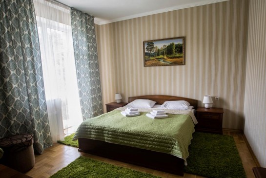 Номер зі зручностями (суміщений санвузол, душ, туалетні аксесуари, фен, халати, одноразові тапочки).У номері:двоспальне широке ліжко, розкладний диван, дві тумбочки з торшерами, журнальний столик, комод , пуфик, ТВ, ХЛ, Wi-Fi, шафа-купе для одягу, електрочайник, столовий набір. Дизайн номера витриманий в класичному стилі. Усі номери з балконом. Прасувальна дошка із праскою на поверсі.
