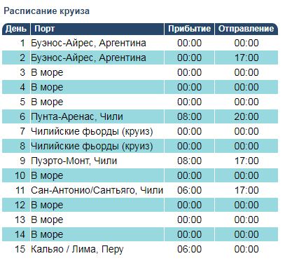 Маршрут: Буенос-Айрес, Аргентина (2 дні) - У море (3 дні) - Пунта-Аренас, Чилі - Чилійські фіорди (круїз 2 дні) - Пуерто-Монт, Чилі - У море - Сан-Антоніо/Сантьяго, Чилі - У море (3 дні) - Кальяо / Ліма, Перу