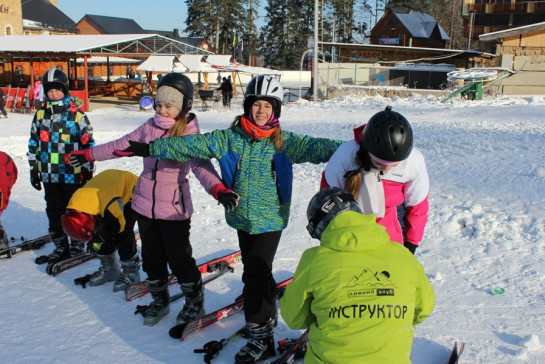 Діти формуються у невеликі групи та зі своїм куратором та інструктором підбирають собі лижі (борди, ковзани).