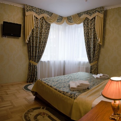 Номер зі зручностями (суміщений санвузол, душ, туалетні аксесуари).У номері:двоспальне широке ліжко, розкладне крісло, дві тумбочки з торшерами, журнальний столик, пуфик, ТВ, ХЛ,Wi- Fi, шафа-купе для одягу, столовий набір. Дизайн номера витриманий у класичному стилі. Прасувальна дошка із праскою на поверсі.