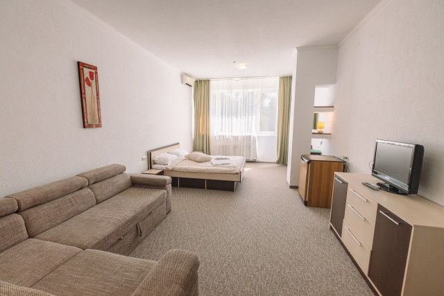 Двокімнатний номер площею 30-40 кв. з двоспальним ліжком у спальні, великим диваном на два додаткові спальні місця у вітальні. , умивальник, унітаз, біде, фен, міні-косметика.